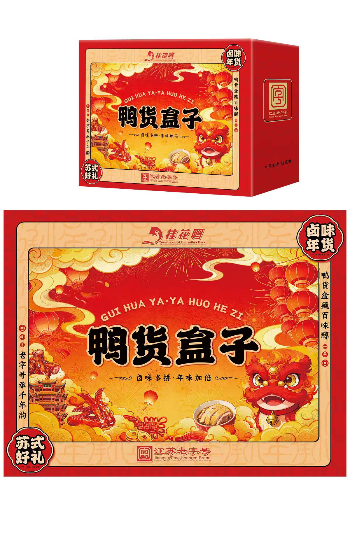 针对年轻消费群体,鸭知味推出桂花鸭—鸭货盒子。该礼盒以工笔水彩插画为视觉载体,融合舞狮、中国结、红灯笼等传统元素与现代包装设计,精准适配年轻群体审美偏好。在坚守百年卤制工艺与老字号品质的同时,该产品兼具休闲食用与礼品馈赠属性,成为连接传统文化与现代生活的美食载体。